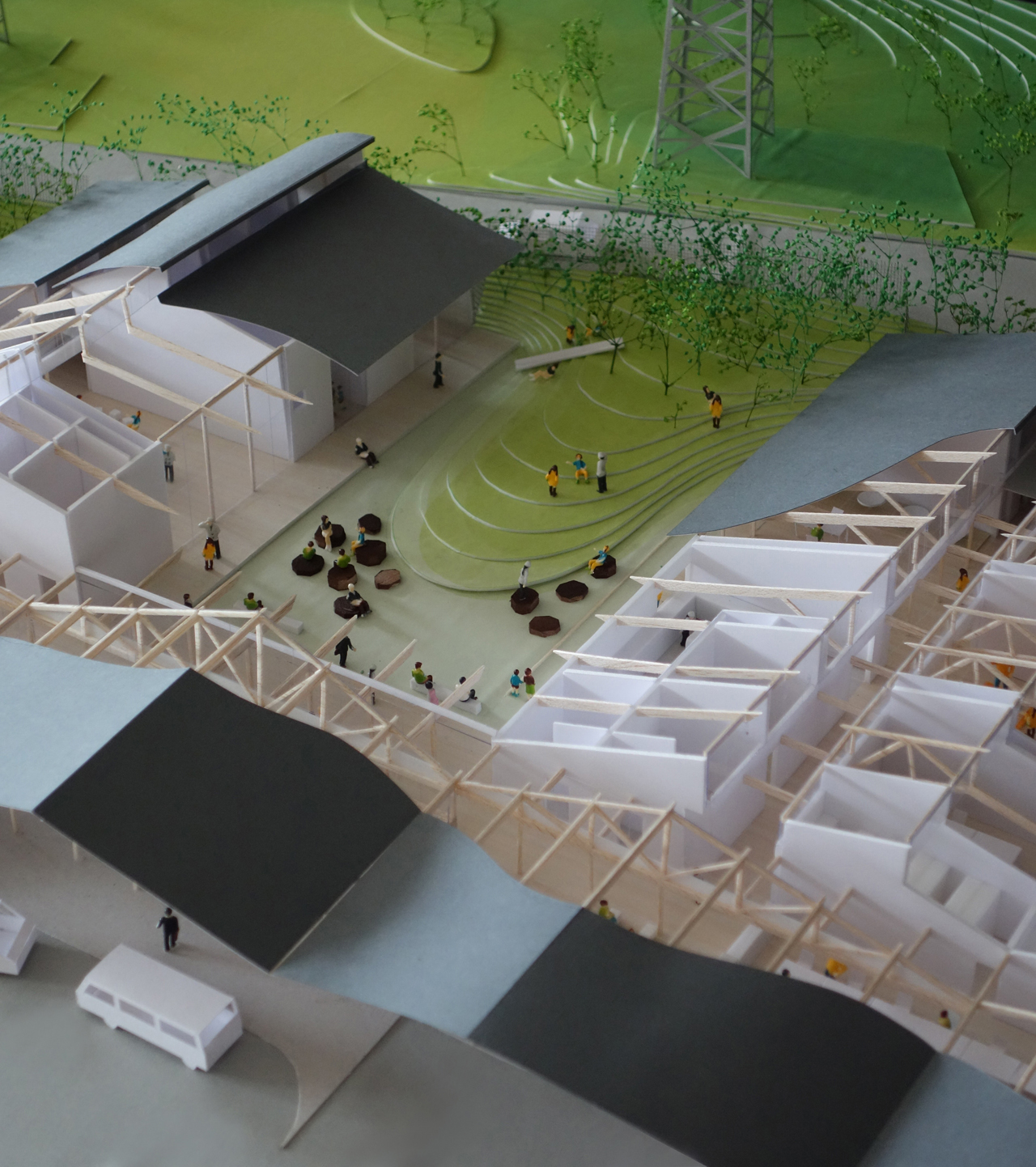 丘陵の裾野である立地をいかし、緑が建物の中にまで入ってくるような施設を提案します。