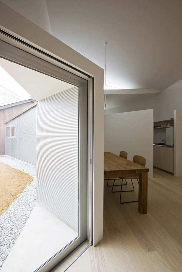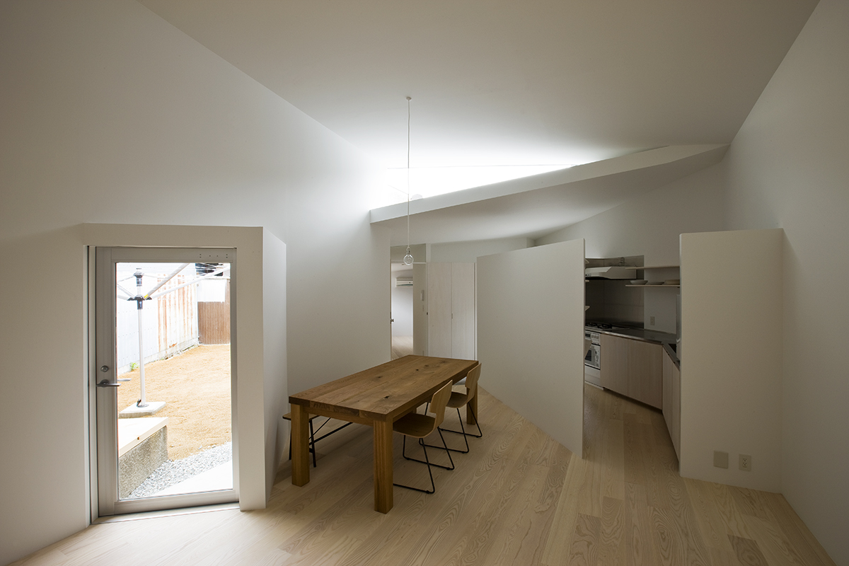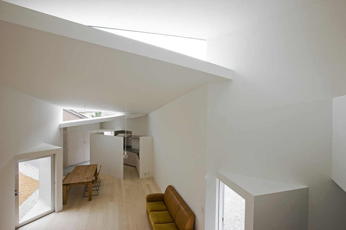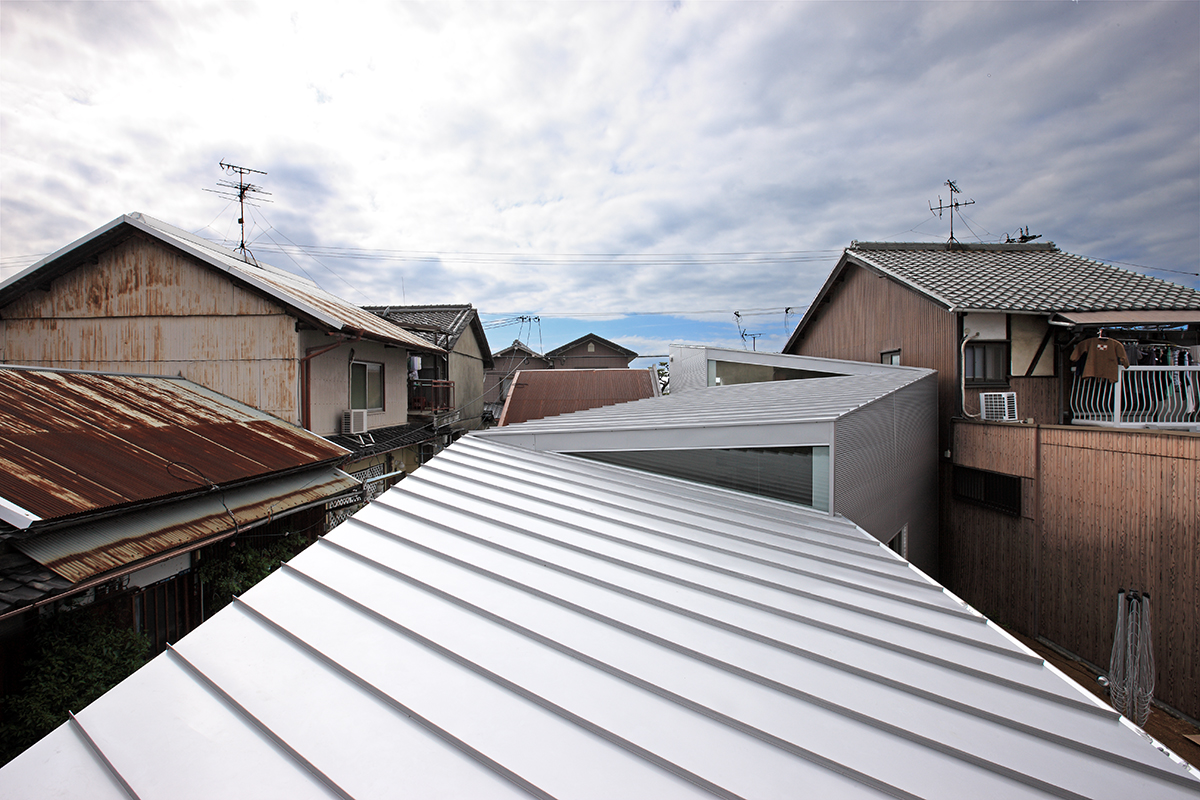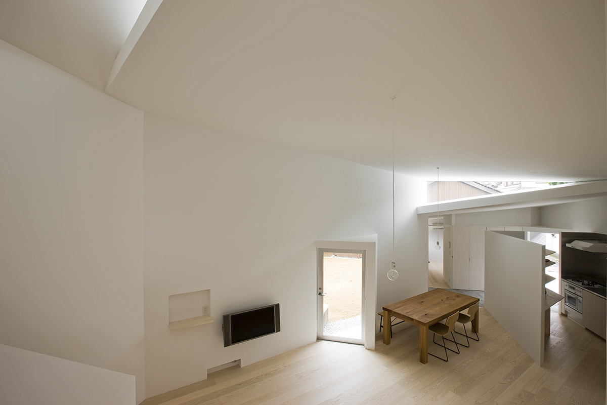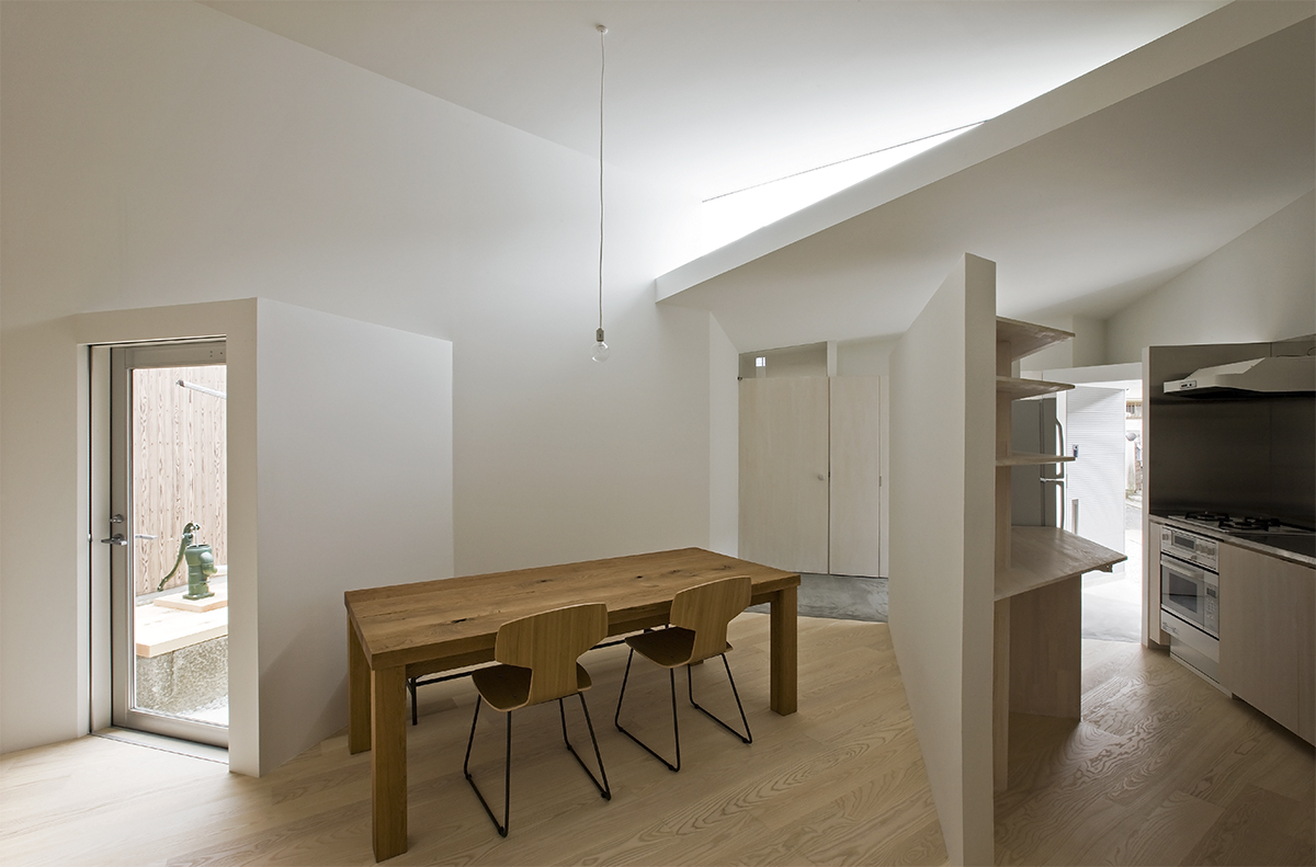 A house situated in a traditional city in Osaka prefecture surrounded by old wooden houses. A long one room house was twisted twice to avoid a exising old house and to form a courtyard, and at the two folding point the high-side lit were formed making use of the gap of the slanted roofs. The interior changing the height from one to two story high, is lighted throughout the day with sunlight reflected by the white ceiling. Along with this long and twisting ceiling gradually shadowed, three entrances cut into the space and the kitchen booth having the same height of 2 meters overlaps white shadows and give depth to the unless simple continuous space. Also the two DOMA (the traditional name of soil or concrete hard floor) space situated under the high-side lit as a transition place between the house and the neighbourhood, used as storage, workshop or buffer zone for everyday life.