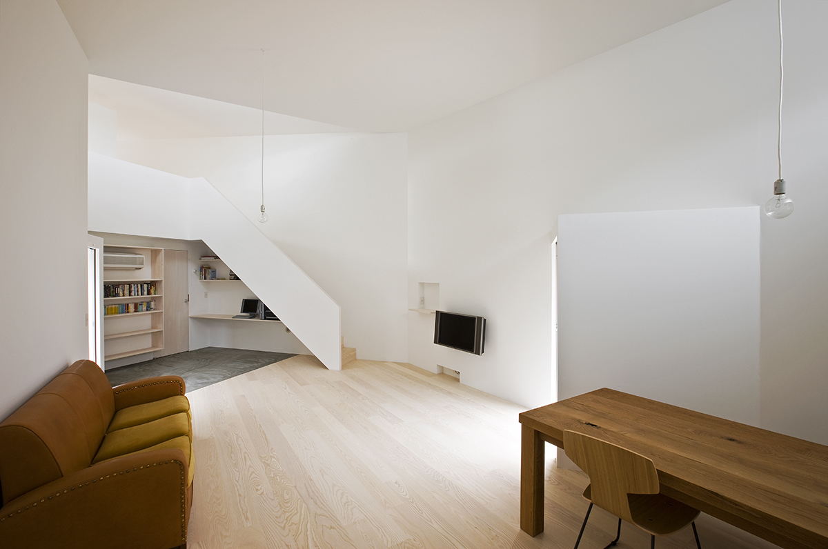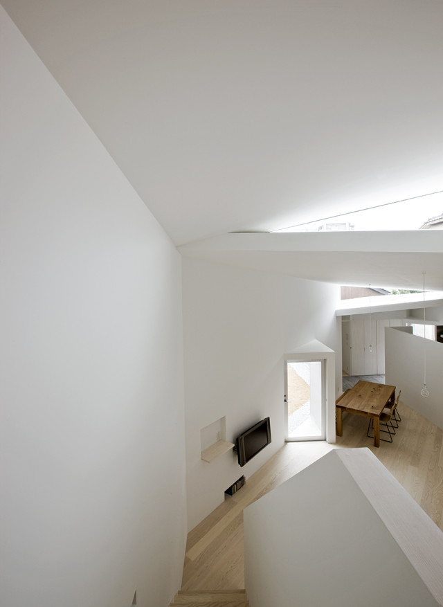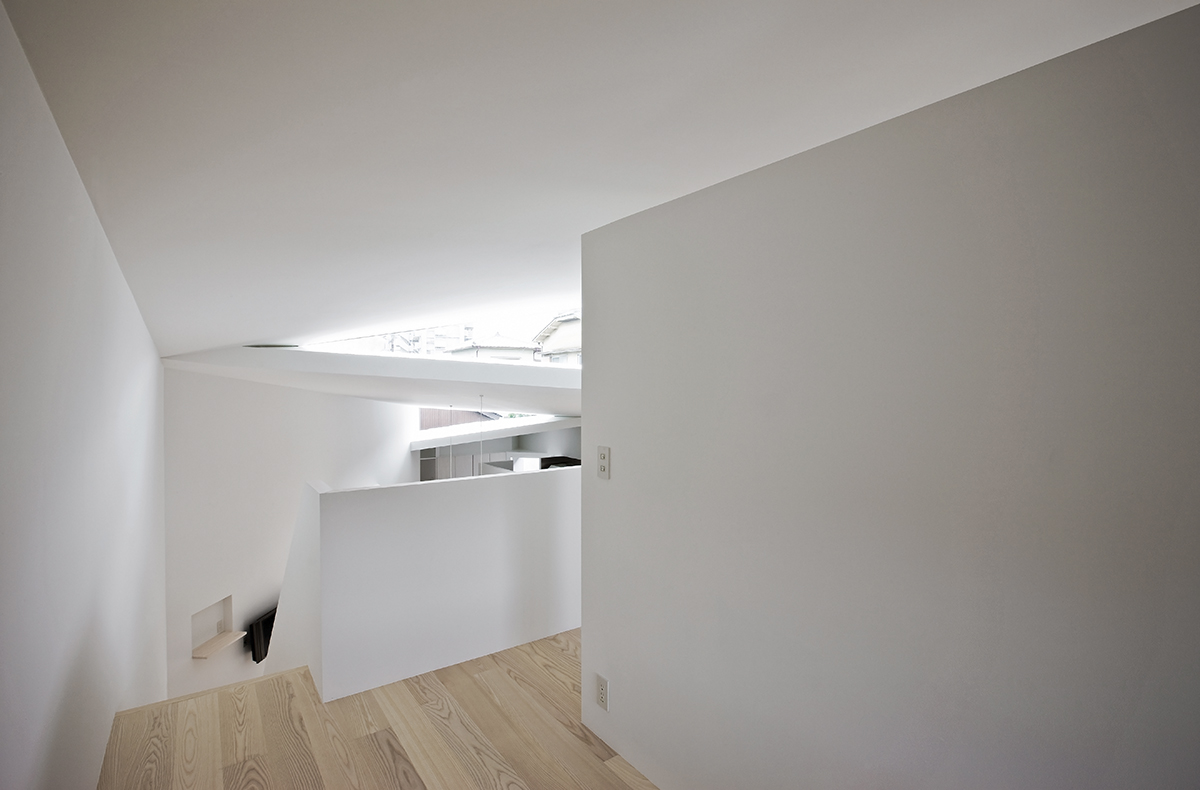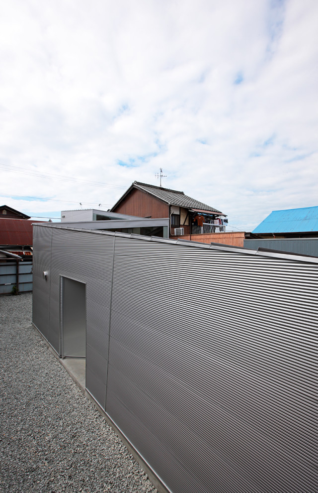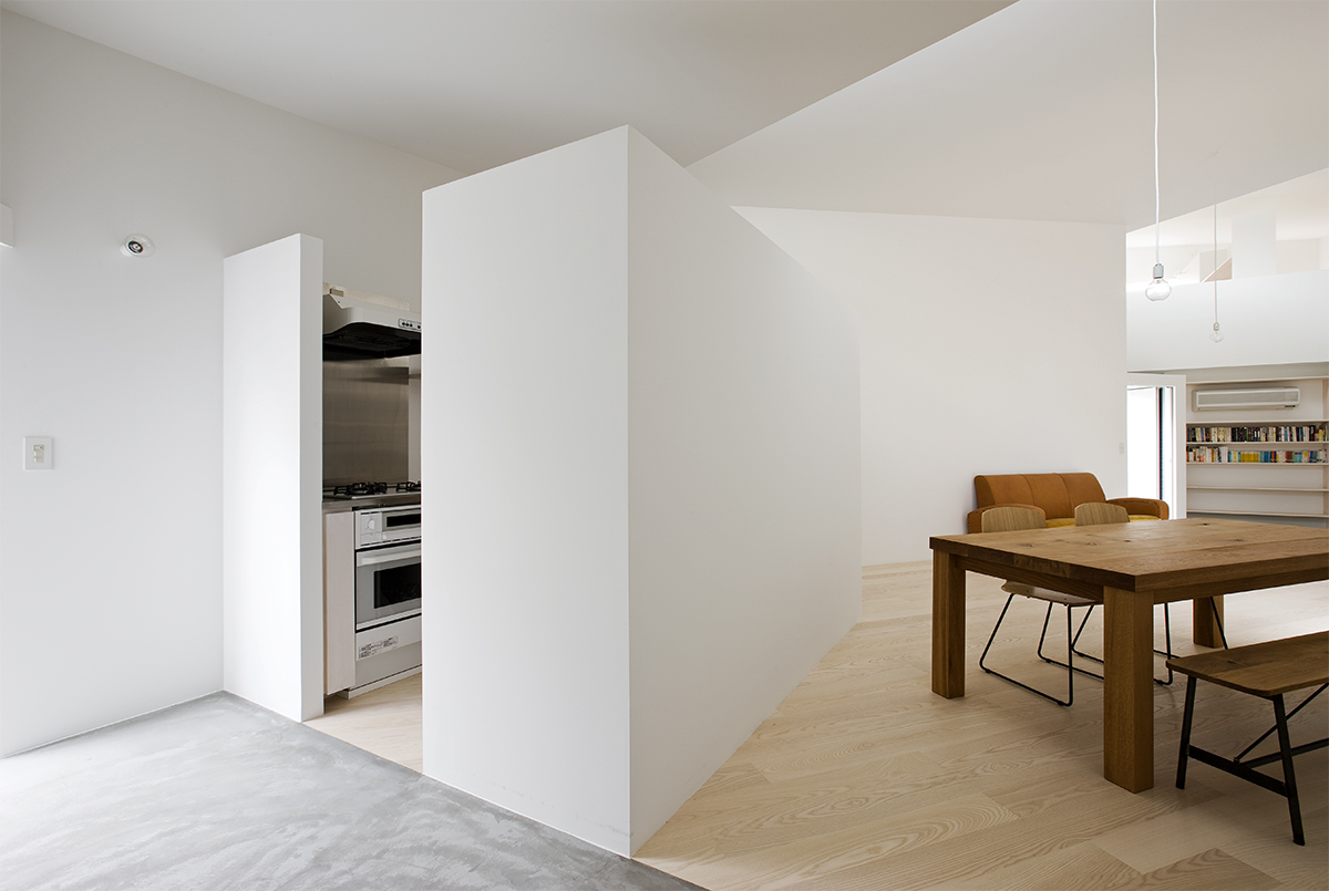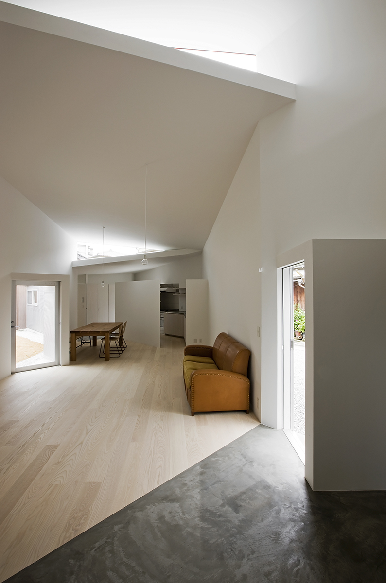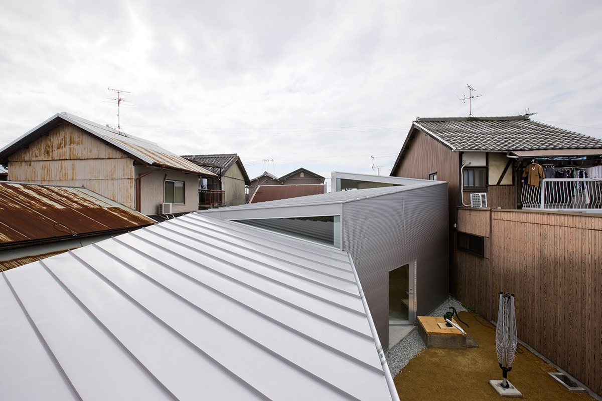 A house situated in a traditional city in Osaka prefecture surrounded by old wooden houses. A long one room house was twisted twice to avoid a exising old house and to form a courtyard, and at the two folding point the high-side lit were formed making use of the gap of the slanted roofs. The interior changing the height from one to two story high, is lighted throughout the day with sunlight reflected by the white ceiling. Along with this long and twisting ceiling gradually shadowed, three entrances cut into the space and the kitchen booth having the same height of 2 meters overlaps white shadows and give depth to the unless simple continuous space. Also the two DOMA (the traditional name of soil or concrete hard floor) space situated under the high-side lit as a transition place between the house and the neighbourhood, used as storage, workshop or buffer zone for everyday life.