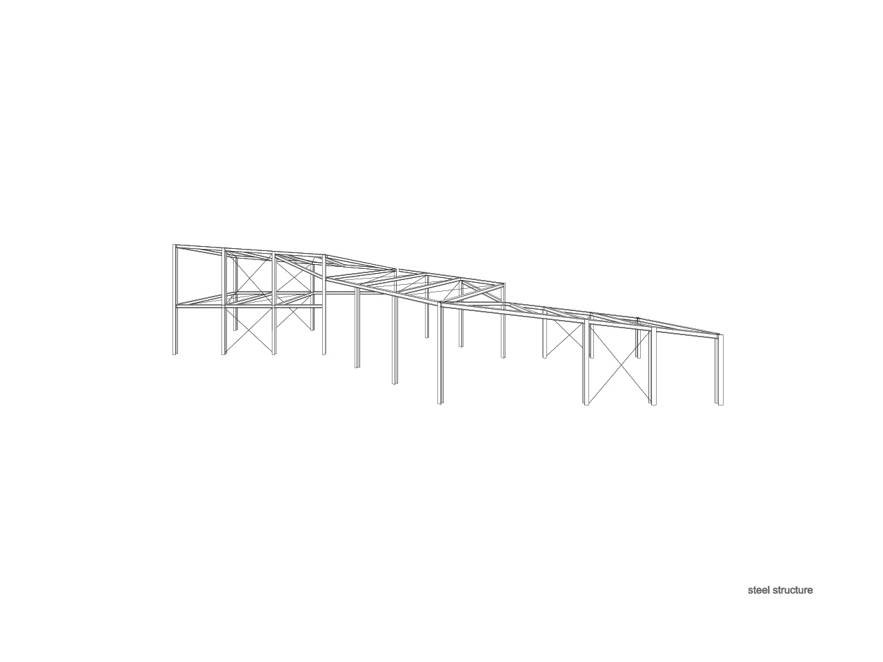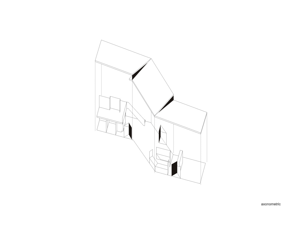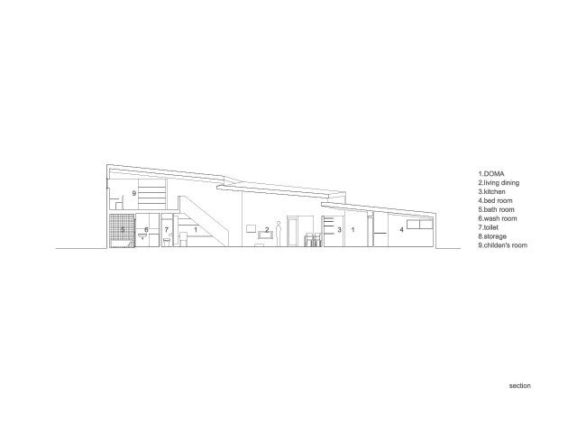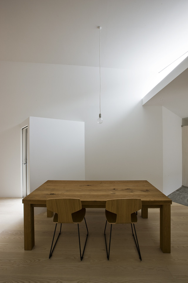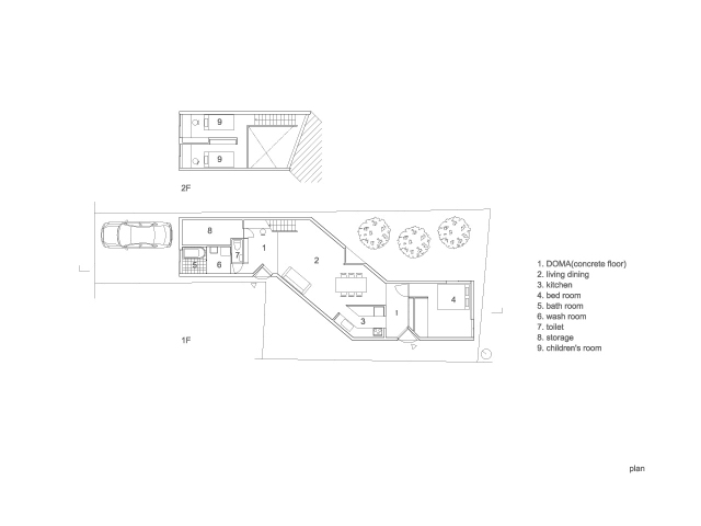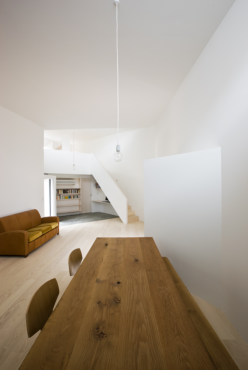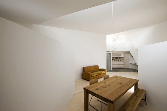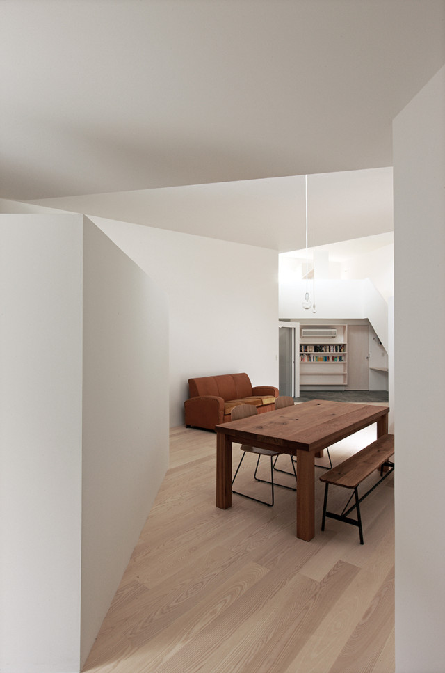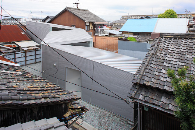 A house situated in a traditional city in Osaka prefecture surrounded by old wooden houses. A long one room house was twisted twice to avoid a exising old house and to form a courtyard, and at the two folding point the high-side lit were formed making use of the gap of the slanted roofs. The interior changing the height from one to two story high, is lighted throughout the day with sunlight reflected by the white ceiling. Along with this long and twisting ceiling gradually shadowed, three entrances cut into the space and the kitchen booth having the same height of 2 meters overlaps white shadows and give depth to the unless simple continuous space. Also the two DOMA (the traditional name of soil or concrete hard floor) space situated under the high-side lit as a transition place between the house and the neighbourhood, used as storage, workshop or buffer zone for everyday life.
