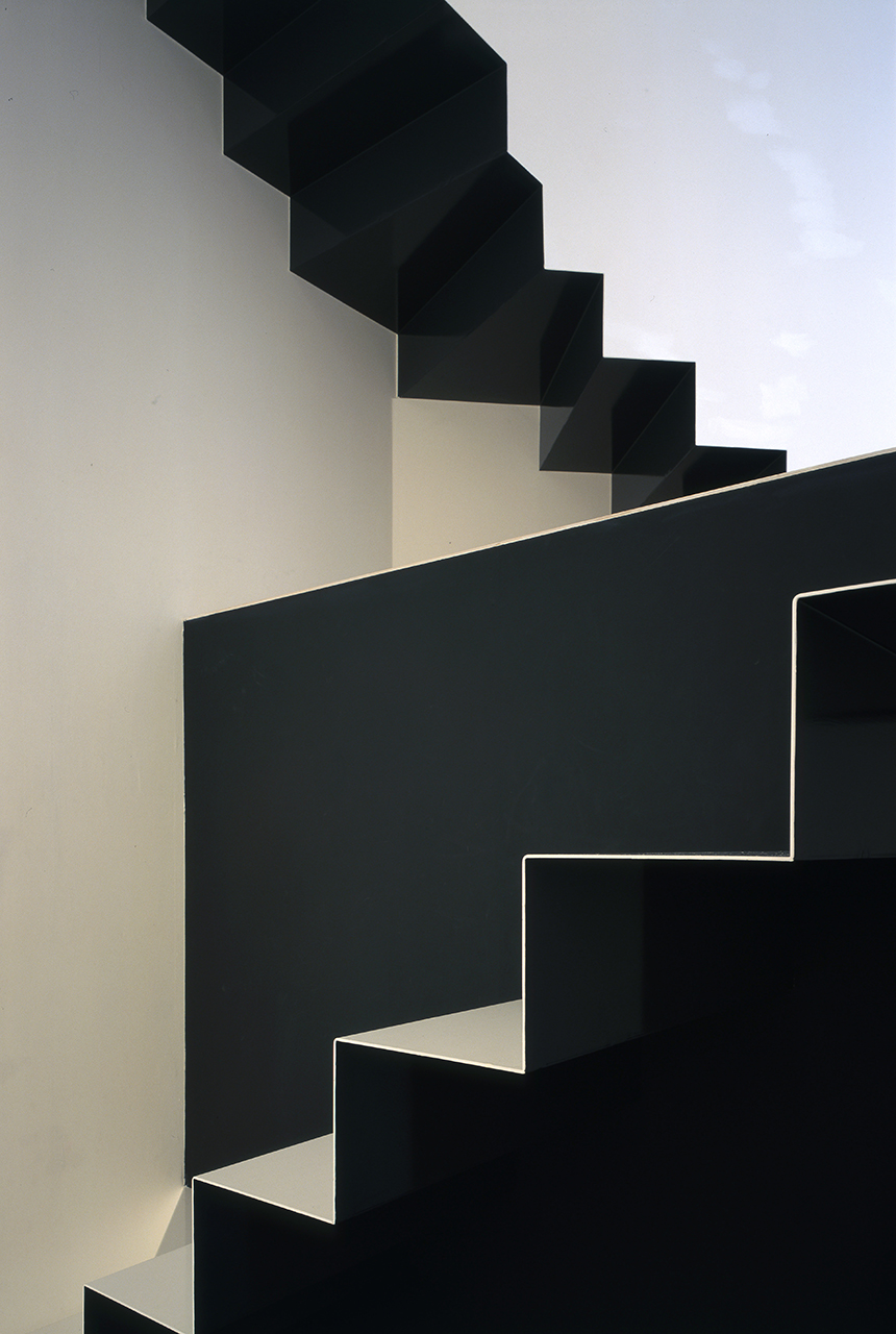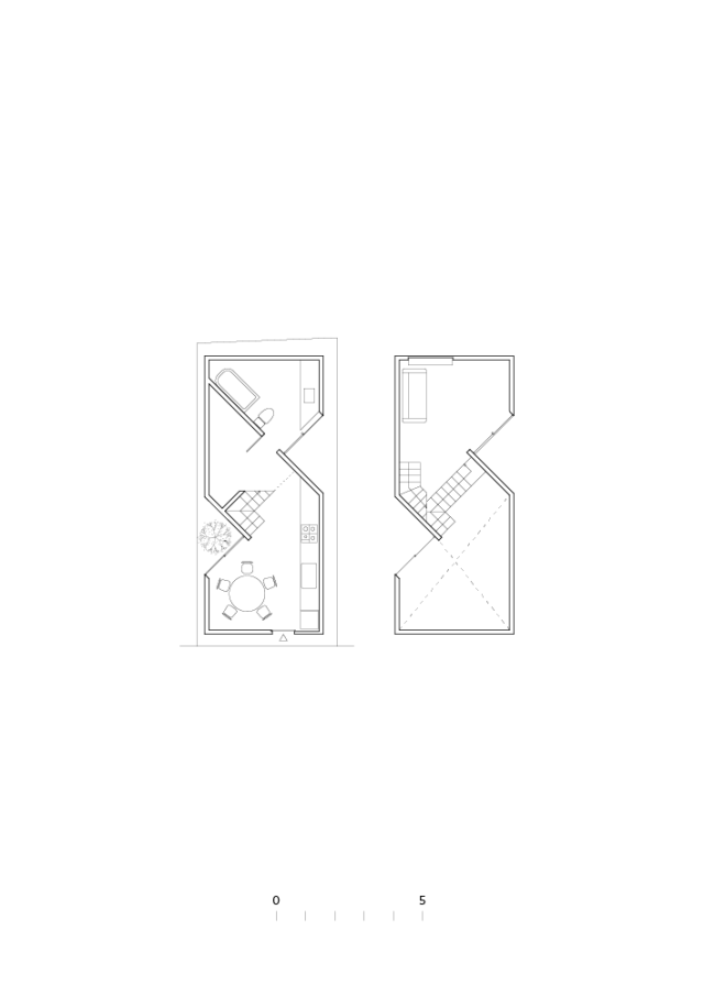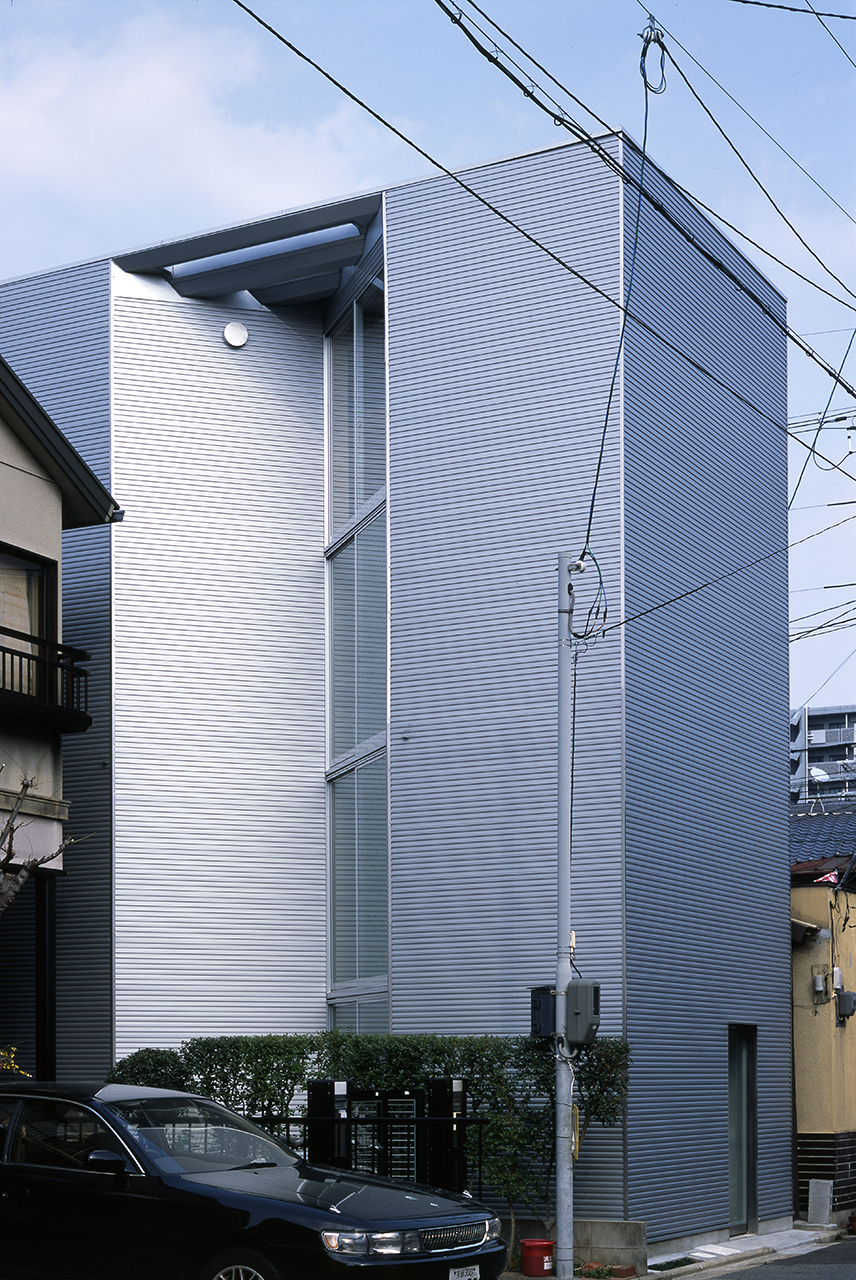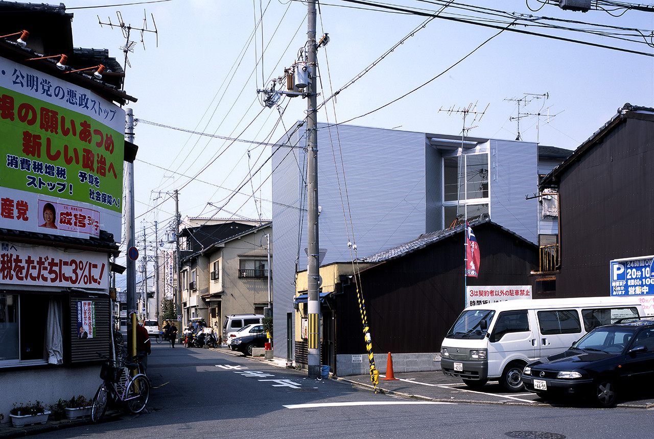 This small house is located on the long and narrow site in Kyoto, the old capital of Japan. We put two V shaped grooves at north-east and south-west boundary point-symmetrically and all windows are set in these grooves which run vertically on each side of this house.