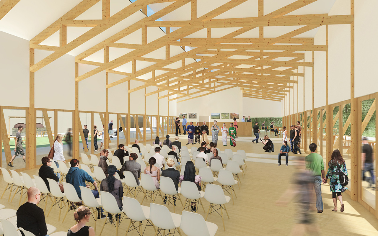 緑豊かな山と眼下に広がる棚田にはさまれた里山交流研修センター。新しい交流体験施設は、このセンターの玄関、顔となると同時に、すでにある建物群同士、さらに建物群と背後に広がる山裾とをつなぎ直します。京都府産材を豊かに美しく組み合わせた建物を、センターの敷地全体が使いやすくなるよう適切に配することで、現在の里山交流研修センターが潜在的に持っている、「森の京都」の魅力を、より強く体験できる場所としたいと思います。