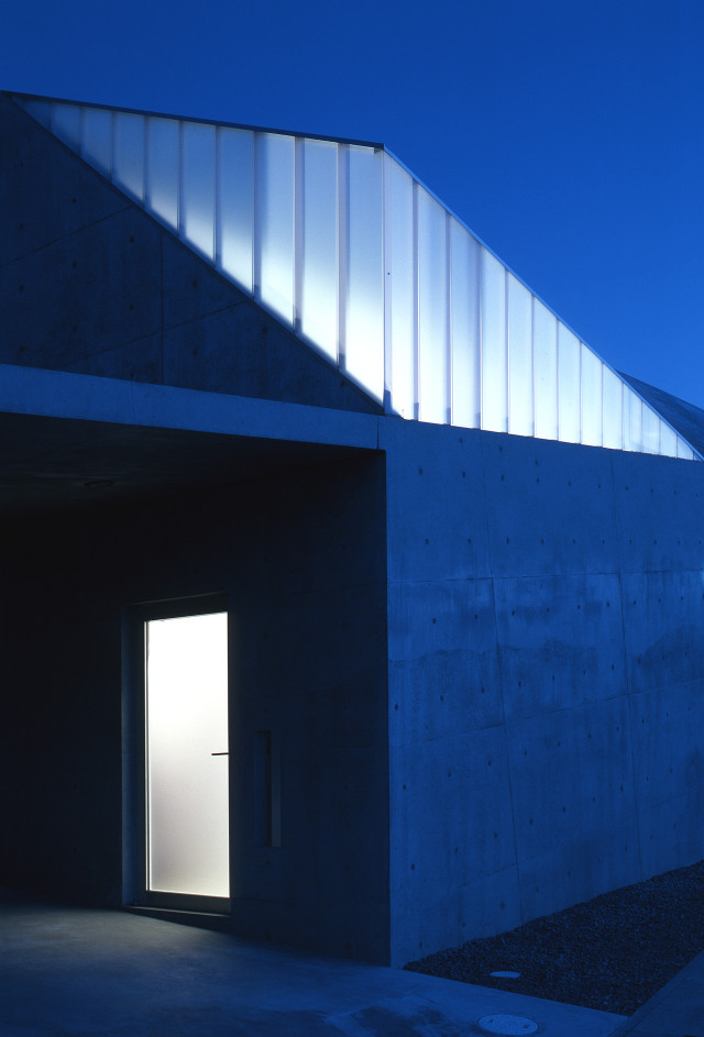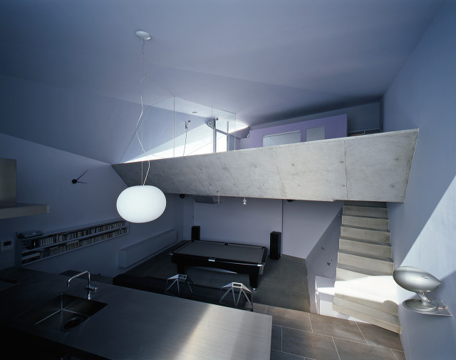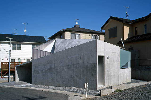 ビリヤードとホームシアターのためのホールのある住宅。変形敷地にあわせて五角形の平面とし、60㎡の無柱空間を実現するためモノコックなRC壁構造とした。強度を確保し、雨水を流し、適切な天井高さを得るために屋根をおりまげ、断面も五角形であり、2ヵ所の三角形の開口からの光が3つのフロアにわかれた不定形のホール全体に反射しながらさしこむ。コンテクスト、プログラムの効率的なレイアウト、無駄のない構造・工法を同列において方程式を解いたシンプルでありながら多様なシーンの得られる内部空間。