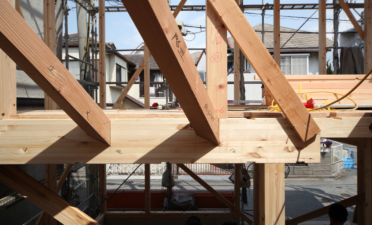 大阪・神戸間に位置する西宮市。敷地は駅から15分ほどの周辺に同サイズの敷地がならぶ住宅地。建物は敷地境界から50cmはなして建てるという地区条例があるので、住宅間には約1mの空地ができ、皆そこに窓をもうけているが、隣家の視線を気にして結局はカーテンをしめっぱなしにしている。このように中途半端に建てこんだ街で、自然の採光や通風そして眺望など、街とのほどよい接続感とはどんなものかを考えた。